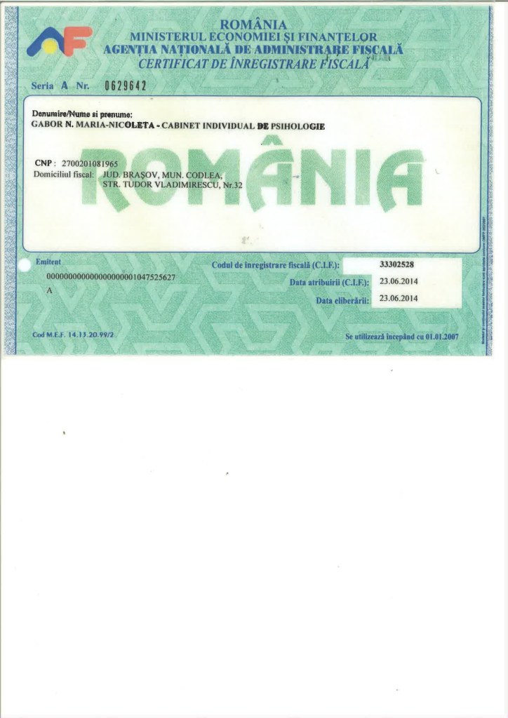 Certificat inregistrare fisca
